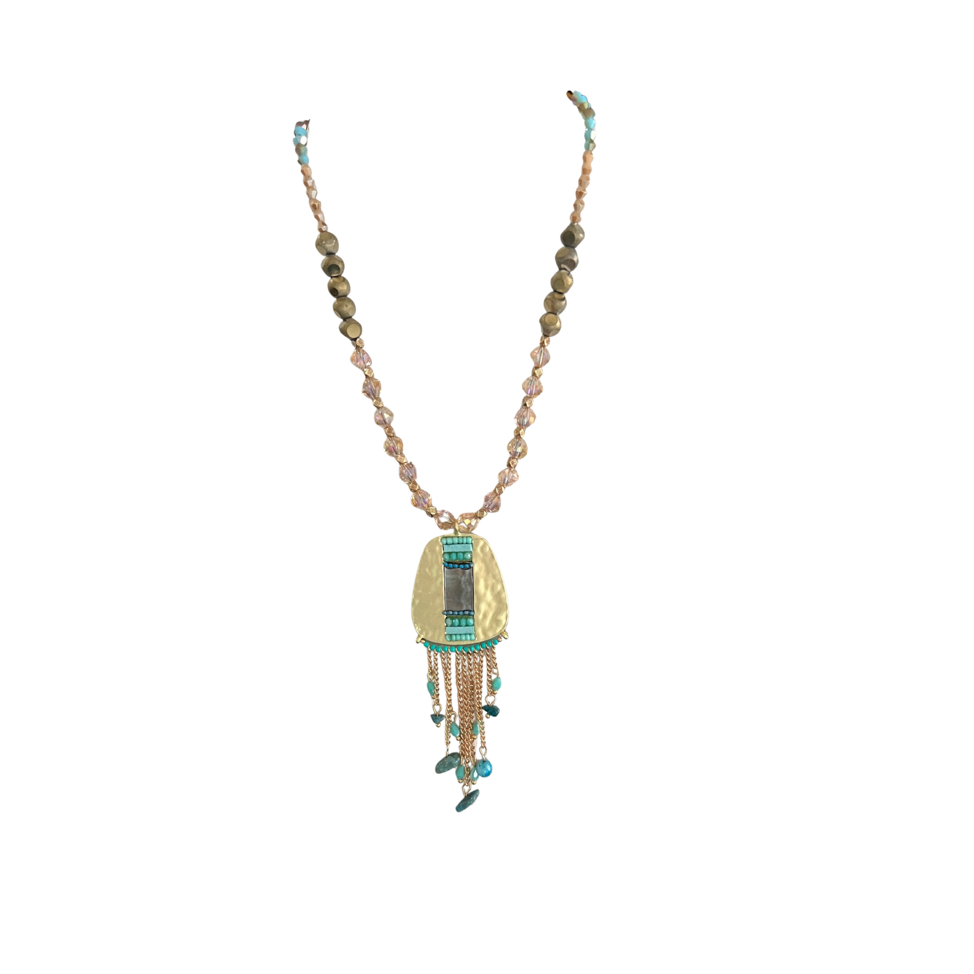 At the center hangs a trapezoid-shaped gold pendant with softly rounded edges, textured like river stones. A vertical rectangle of genuine shell sits at its heart, bookended by turquoise beads. Below, a delicate fringe of turquoise beads dangles on varied chains, evoking the rhythmic dance of water drops falling into a stream.
