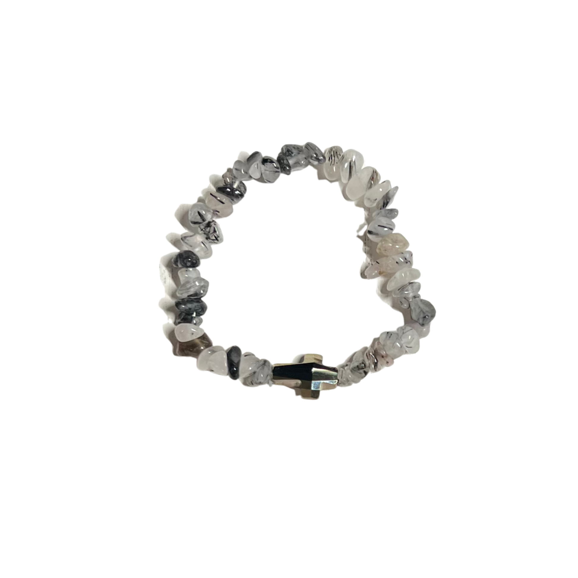 Refiner's Fire Bracelet With Black Tourmaline Quartz Beads and Smoky Cyrstal Cross