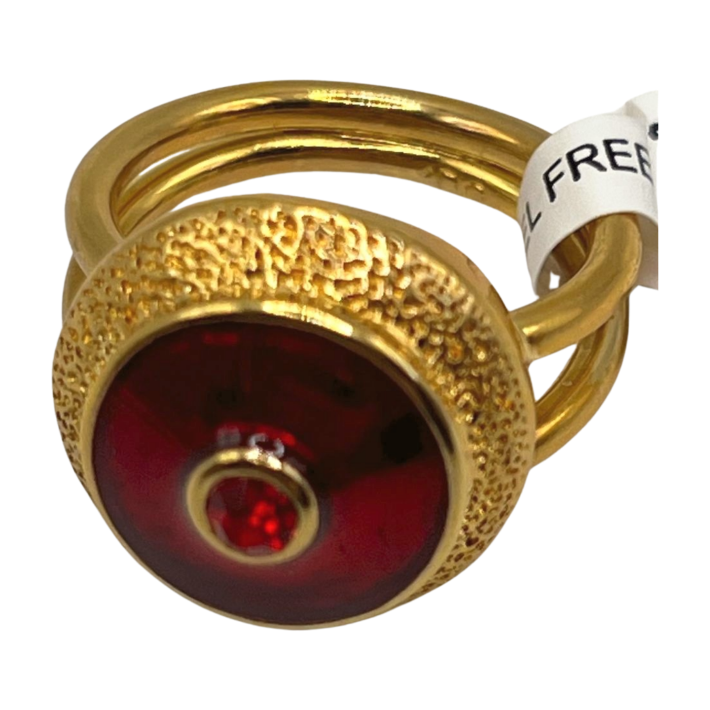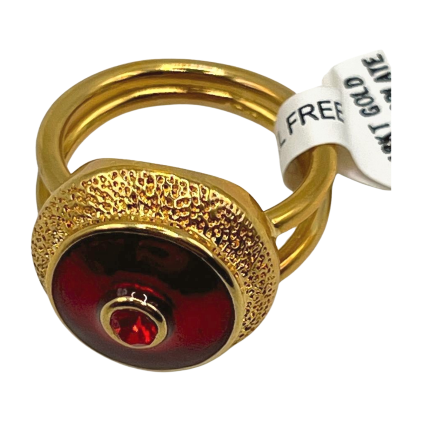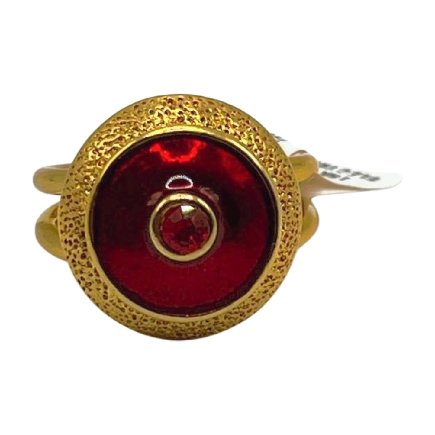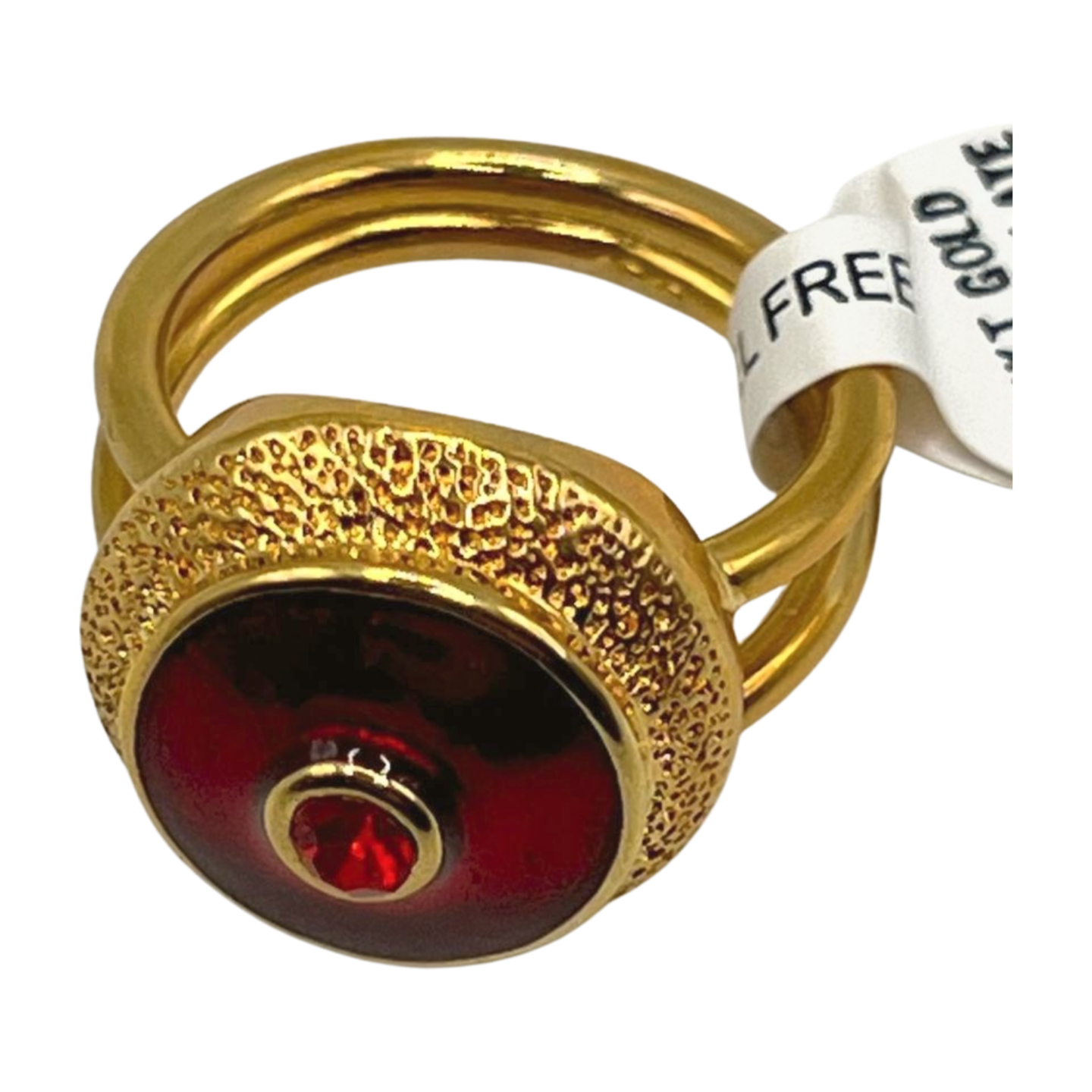 This beautiful designer ring, has weight to it and is truly stunning. Made with glossy apple-colored red enamel and a center red Swarovski crystal, this piece made in Israel by Dophin Ore is gorgeous.